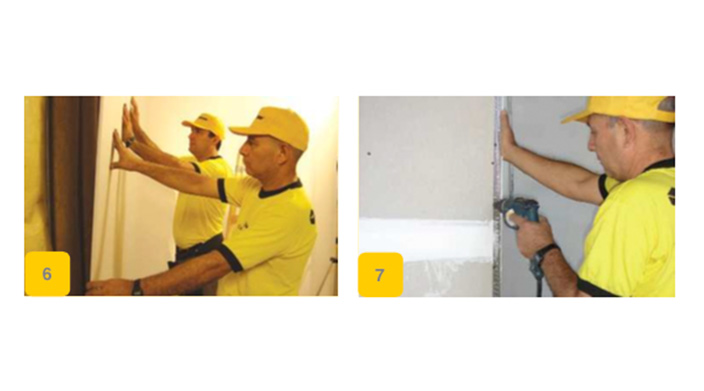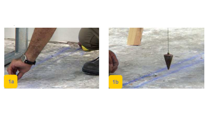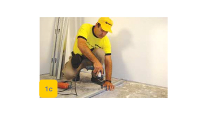 Una vez replanteada la posición de la pared utilizando hilo entizado, se fija al piso la Solera inferior, mediante Tarugos de expansión de nylon Nº 8 y tornillos de acero de 6mm de diámetro x 40 mm, colocados con una separación máxima de 0, 60 m. Luego se fija la Solera superior, trasladando su posición con plomada o nivel laser.
