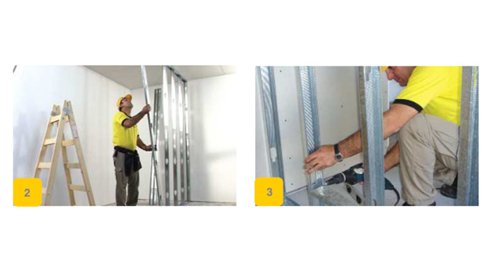 se ubican los Montantes con una separación de 0,40 m ó 0,48 m entre ejes. Las fijaciones entre perfiles se realizan con tornillos autorroscantes T1, punta aguja.