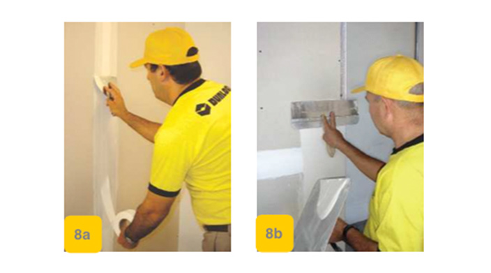 (ver IT-Niveles de masillado y CS-Tomado de juntas ), se realiza el tomado de juntas con Masilla Durlock® y cinta de papel microperforada y el masillado de fijaciones y perfiles de terminación.